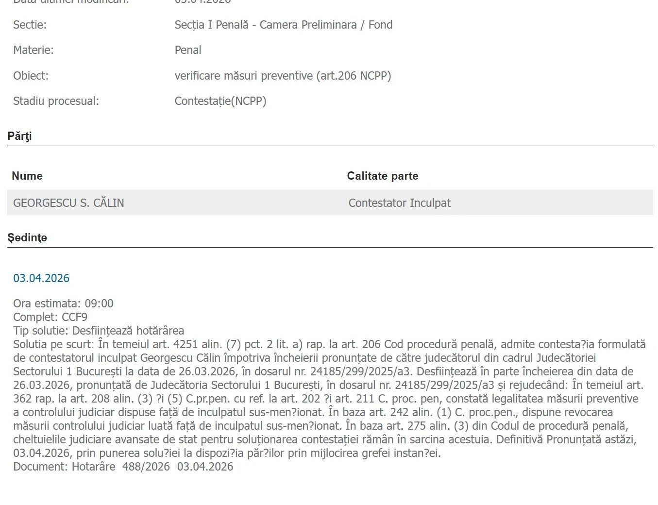 Astăzi au reușit avocații, împreună cu Călin Georgescu, să convingă instanța că nu se mai justifică prelungirea acestei măsuri și mai cu seamă să fie revocată complet.