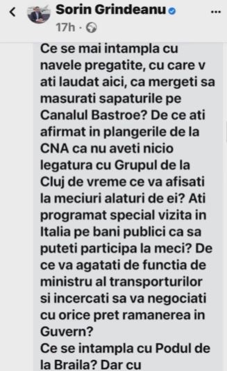 Pagina de Facebook a lui Sorin Grindeanu a fost asaltată de telespectatori ai emisiunii "Culisele Statului ", după ce ministrul Transporturilor sau administratorii profilului său au șters un mesaj în care Anca Alexandrescu i-a cerut să răspundă concret unor întrebări legate de modul în care administrează ministerul, dar și despre situația unor companii din subordine, cum ar fi CFR.
