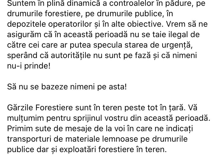 “Suntem în plină dinamică a controalelor în pădure, pe drumurile forestiere, pe drumurile publice, în depozitele operatorilor și în alte obiective. Vrem să ne asigurăm că în această perioadă nu se taie ilegal de către cei care ar putea specula starea de urgență, sperând că autoritățile nu sunt pe fază și că nimeni nu-i prinde! Să nu se bazeze nimeni pe asta!