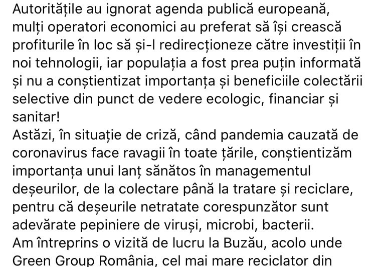 “Autoritățile au ignorat agenda publică europeană”, continuă Alexe pe pagina sa de socializare, “operatorii economici au preferat să își crească profiturile în loc să și-l redirecționeze către investiții în noi tehnologii, iar populația a fost prea puțin informată și nu a conștientizat importanța și beneficiile colectării selective din punct de vedere ecologic, financiar și sanitar! Astăzi, în situație de criză, când pandemia cauzată de coronavirus face ravagii în toate țările, conștientizăm importanța unui lanț sănătos în managementul deșeurilor, de la colectare până la tratare și reciclare, pentru că deșeurile netratate corespunzător sunt adevărate pepiniere de viruși, microbi, bacterii.”